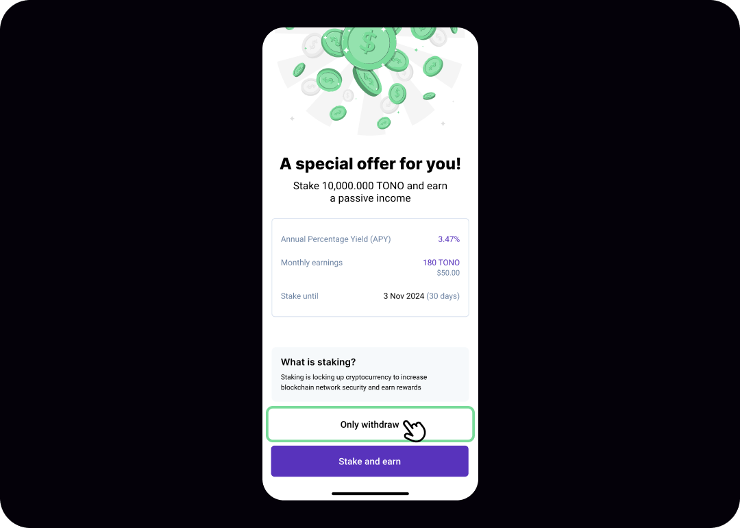 3. If you want to withdraw and then stake, it’s super easy, just tap Stake and earn. Otherwise, skip the special offer and tap Only Withdraw
