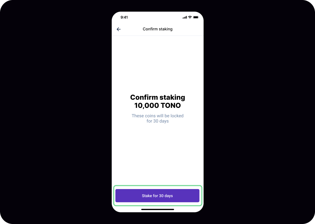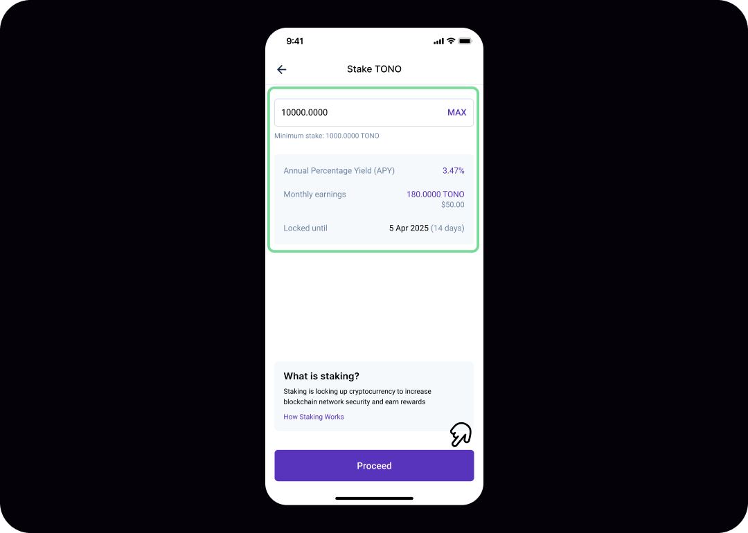 3. On the Stake Tono screen, enter how many TONO tokens you want to stake and review the conditions. When ready, tap Proceed
